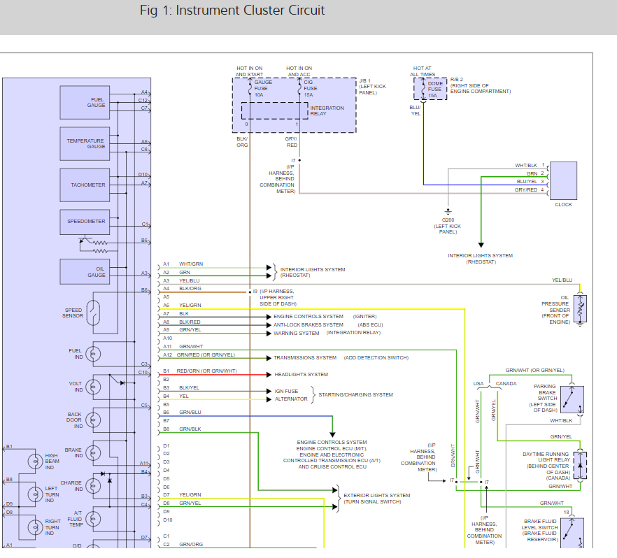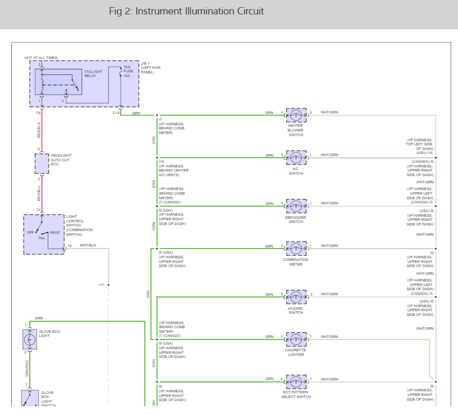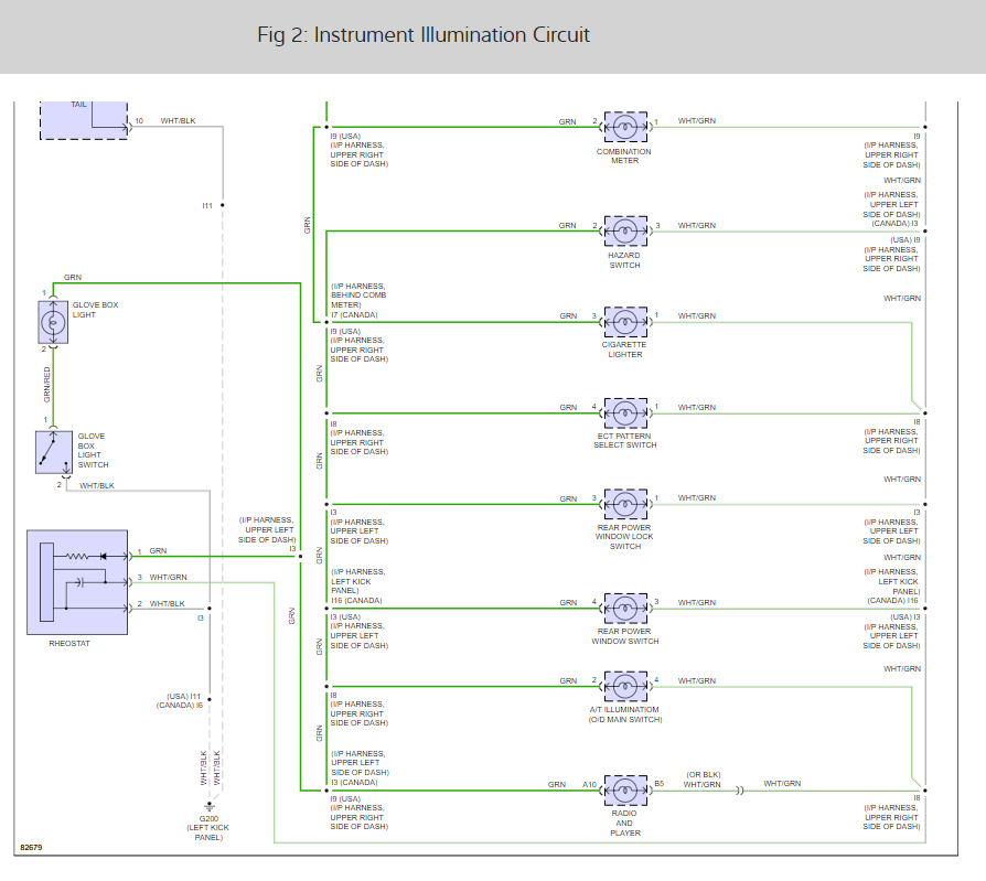 The glove box light also is fed from this circuit, but it is not controlled by the dimmer. If that light works, that takes care of the positive side of the circuit. The 12 volts comes from the tail lamp relay, so according to my diagram, you won't have a glove box light unless the running / tail lights are turned on.