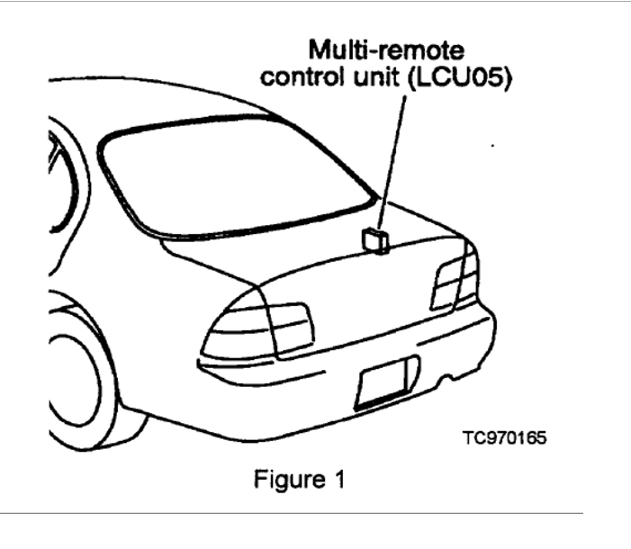 3. If the system checks out OK and the customer usually locks the doors before starting the car, replace the multi-remote control unit (LCUO5) in the trunk with the countermeasure unit as follows (see Figure 1,):
