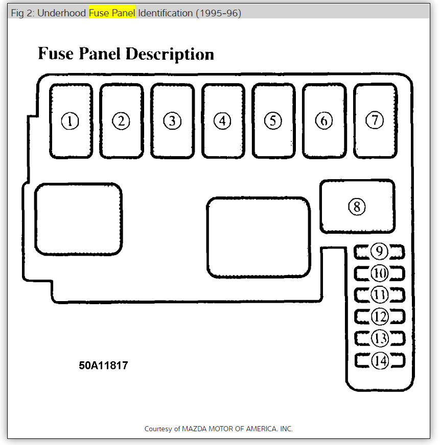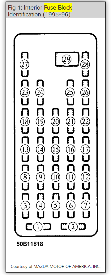 I'm looking for fuse box diagram for 1996 mazda protege LX. My license plate light and my radio is not working, as well as my OBD plug.