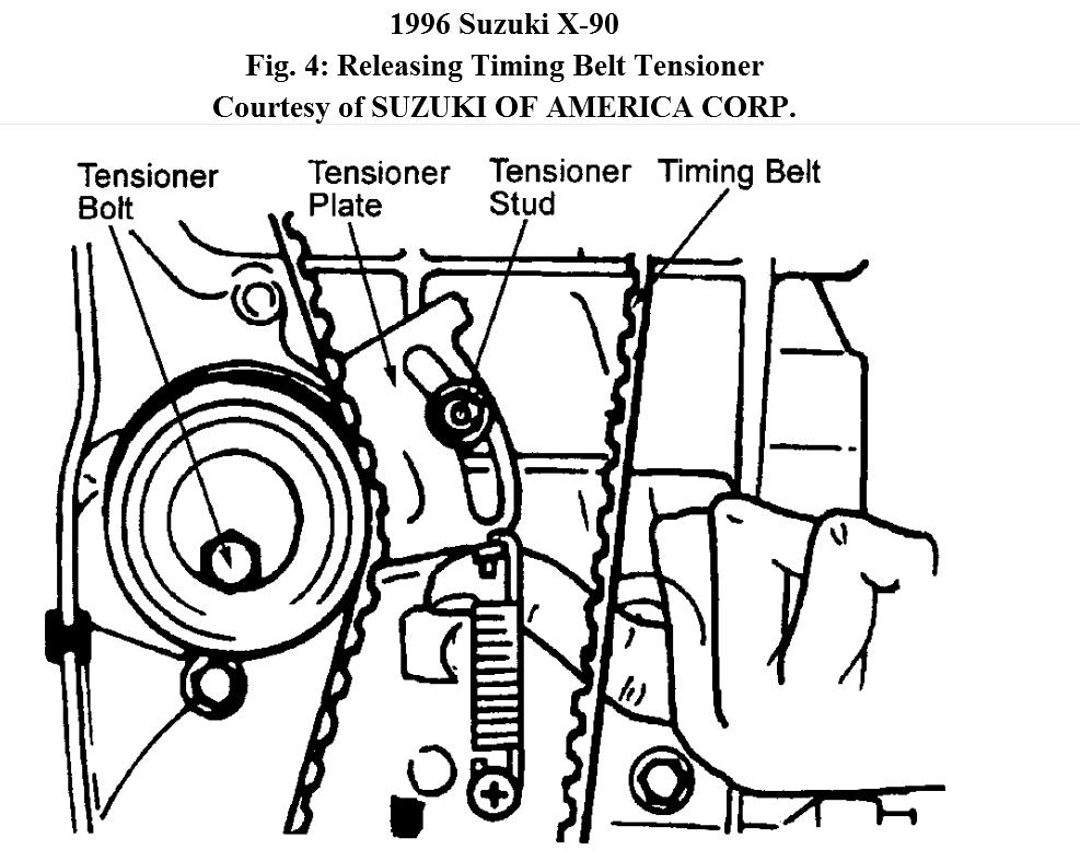 3. Rotate crankshaft clockwise to align timing marks. See Fig. 2 and Fig. 3 . Stamped "E" or punch mark on camshaft sprocket must straight up. Loosen timing belt tensioner bolt and stud nut. Move tensioner away from belt, and hand tighten bolt and nut. See Fig. 4 . If reusing old belt, mark belt with an arrow indicating direction of rotation for installation reference. Remove timing belt.
