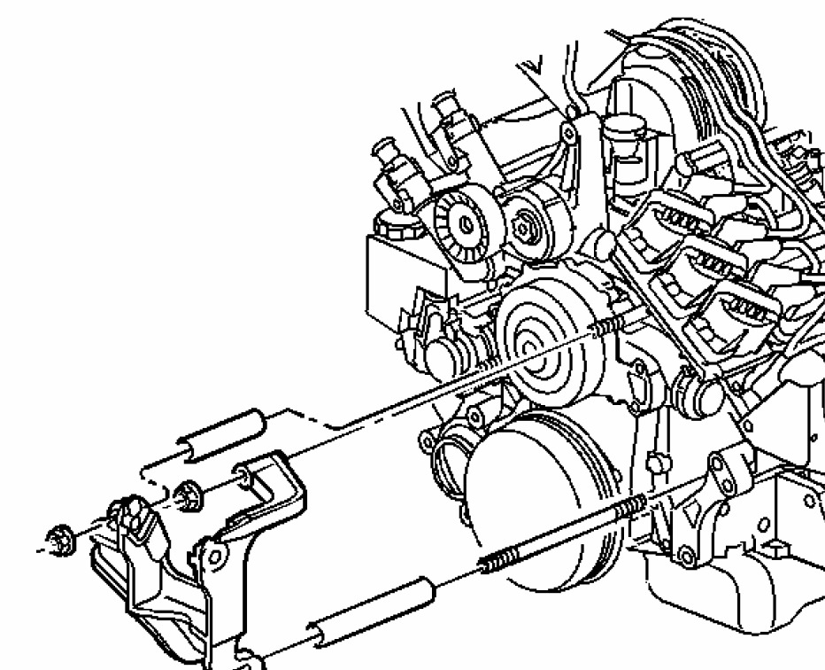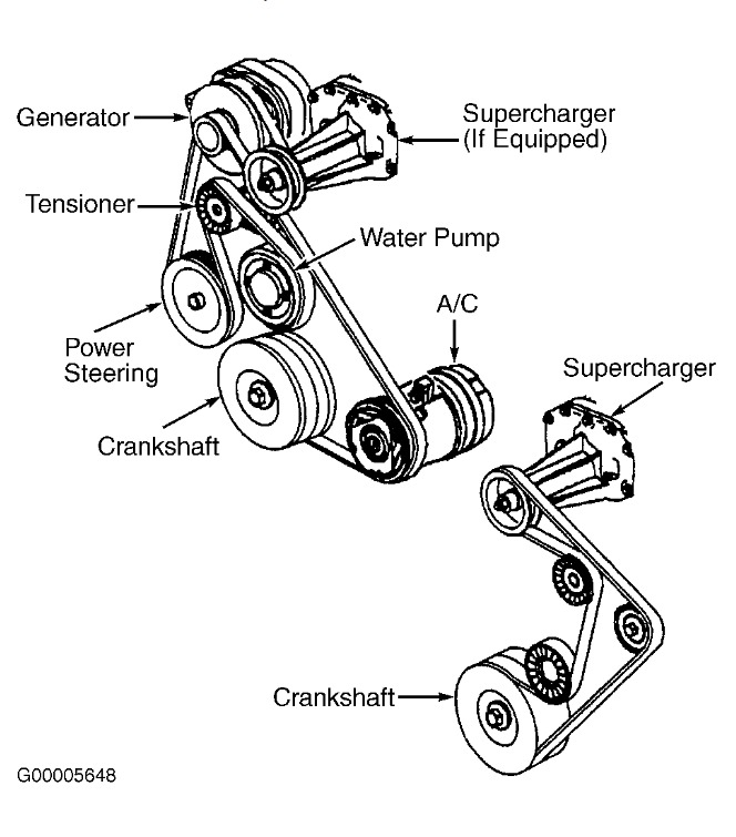 The supercharged 3800 engine uses two accessory drive belts. The outer belt drives the supercharger. The inner belt drives the generator, power steering pump, coolant pump and air conditioning compressor. All driven accessories are rigidly mounted to the engine. Drive belt tension is maintained by the spring loaded belt tensioners. Each belt has its own tensioner.