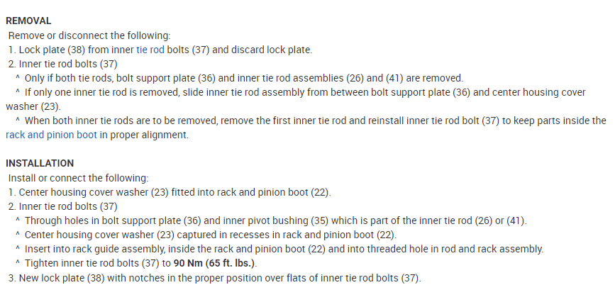 I've attached picture steps below on how to change the inner tie rod ends on your vehicle which includes the torque specification. The tie rod ends need to be torqued to 90NM (Newton Meters) or 65 Ft. Lbs. Hope this helps and thanks for using 2CarPros.