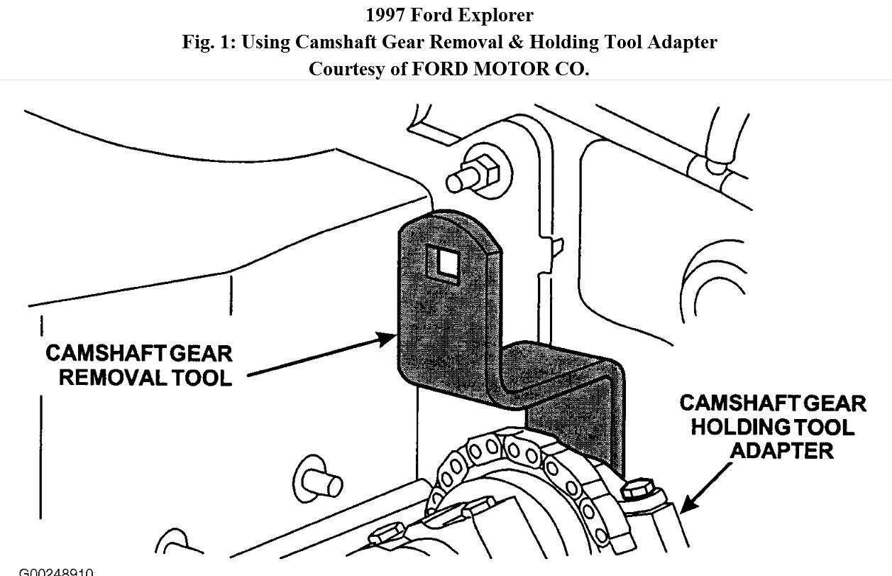 3. Using Camshaft Gear Removal Tool (T97T-6256-F), loosen right camshaft sprocket bolt. Loosen top bolts of Camshaft Gear Holding Tool (T97T-6256-B). See Fig. 1.