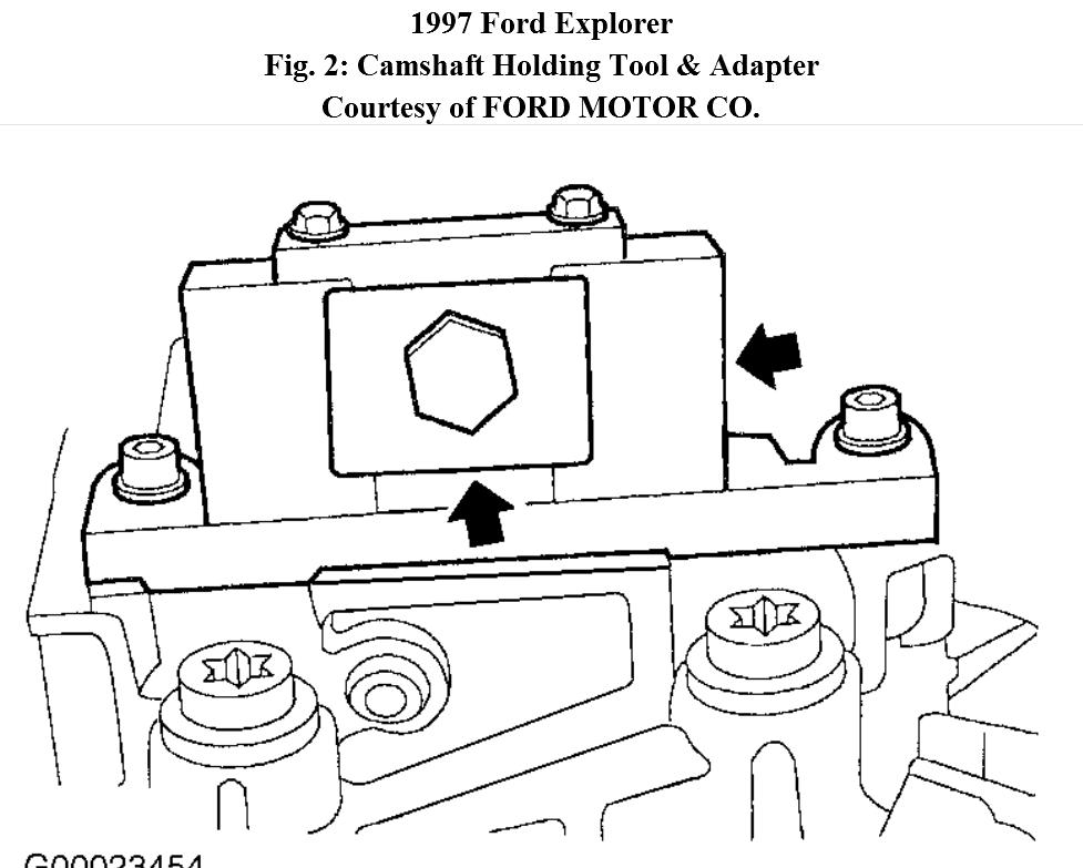 4. Position the camshaft timing slots below centerline of camshaft to allow proper installation of Camshaft Holding Tool (T97T-6256-C) and Adapter (T97T-6256-0) onto the cylinder head. Then, install both tools onto cylinder head. See Fig. 2.