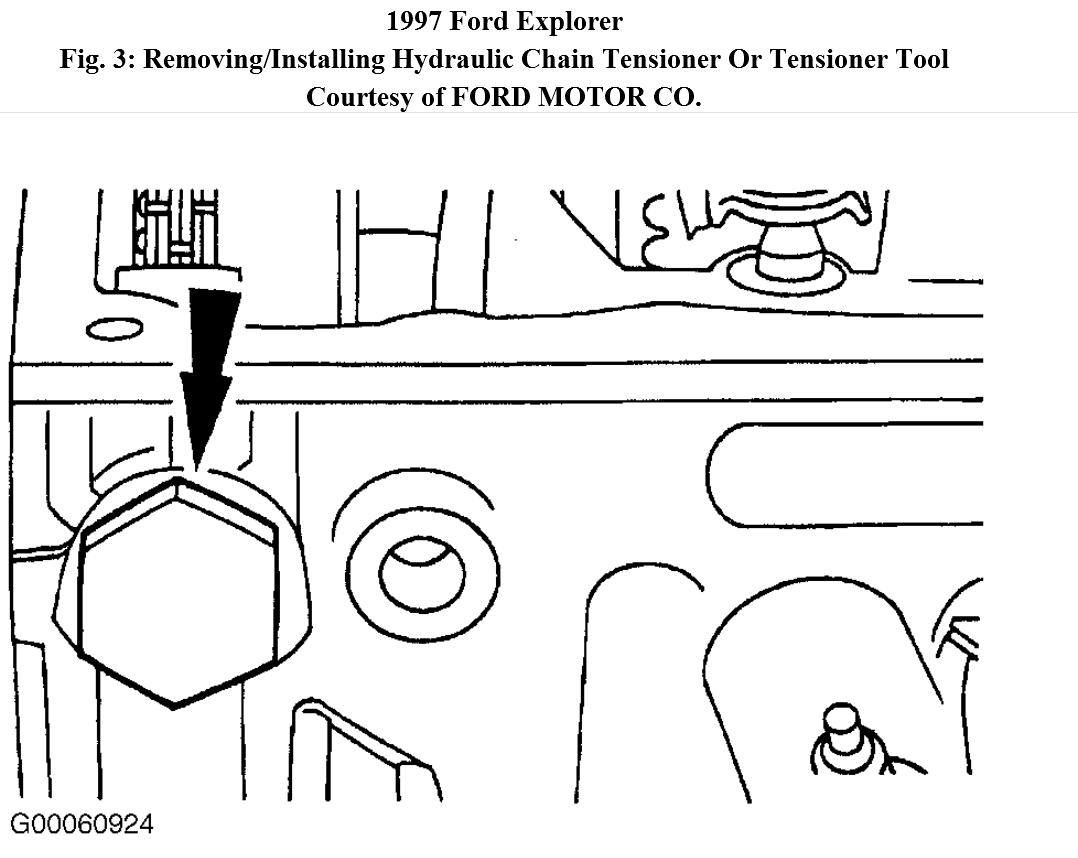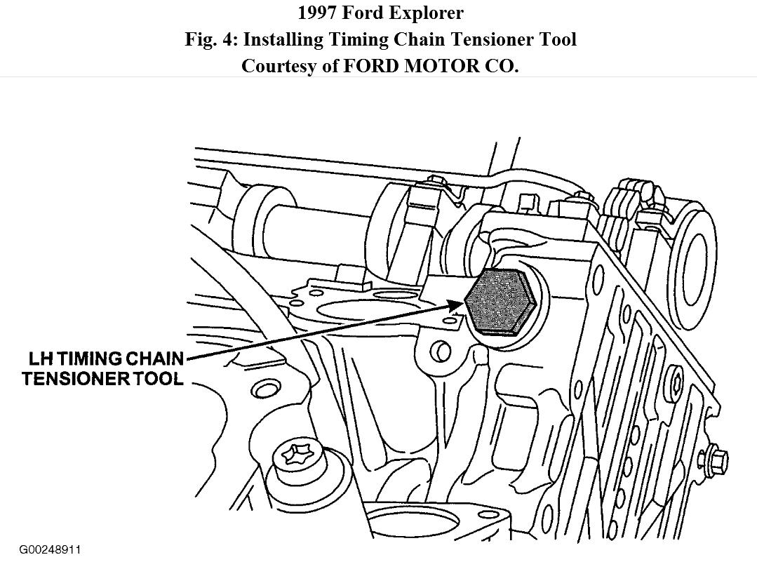 5. Raise and support vehicle. Remove right wheel and tire. Remove lower splash shield. Remove right camshaft tensioner and install Timing Chain Tensioner Tool (T97T-6K254-A). See Fig. 3. Remove vehicle supports and lower vehicle.