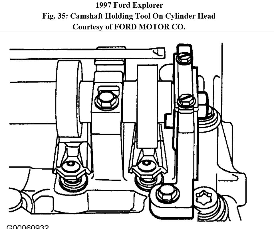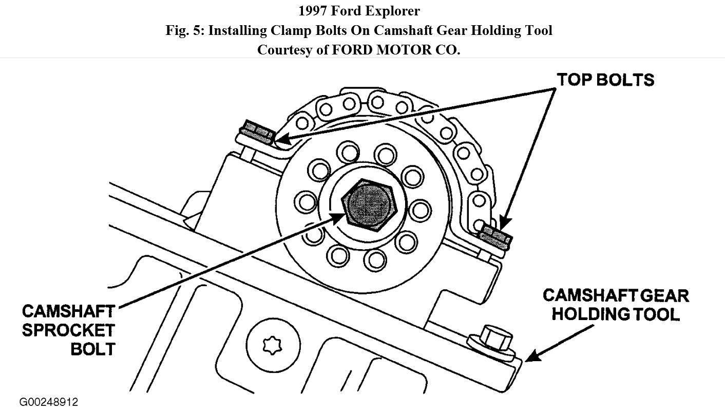6. Tighten top 2 clamp bolts on Camshaft Gear Holding Tool (T97T-6256-B) to 89 INCH lbs. (10 N.m). Then, tighten camshaft sprocket bolt to 63 ft. lbs. (85 N.m). See Fig. 1.