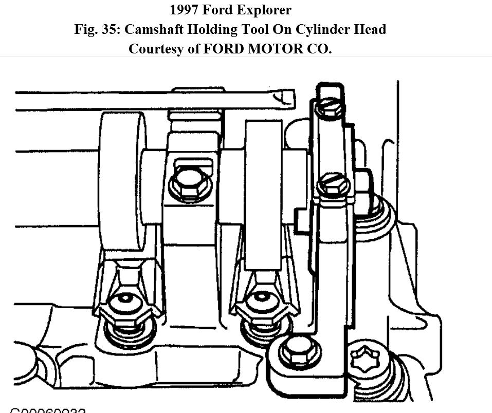 Leave top 2 clamp bolts loose on Camshaft Gear Holding Tool (T97T-6256-B).