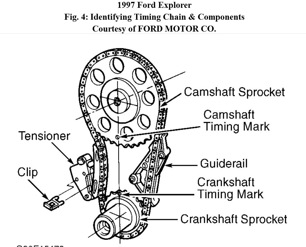 10. Remove left camshaft tensioner and install Timing Chain Tensioner Tool (T97T-6K254-A). See Fig. 4. Tighten top 2 clamp bolts on Camshaft Gear Holding Tool (T97T-6256-B) to 89 INCH lbs. (10 N.m). Then, tighten camshaft sprocket bolt to 63 ft. lbs. (85 N.m). See
