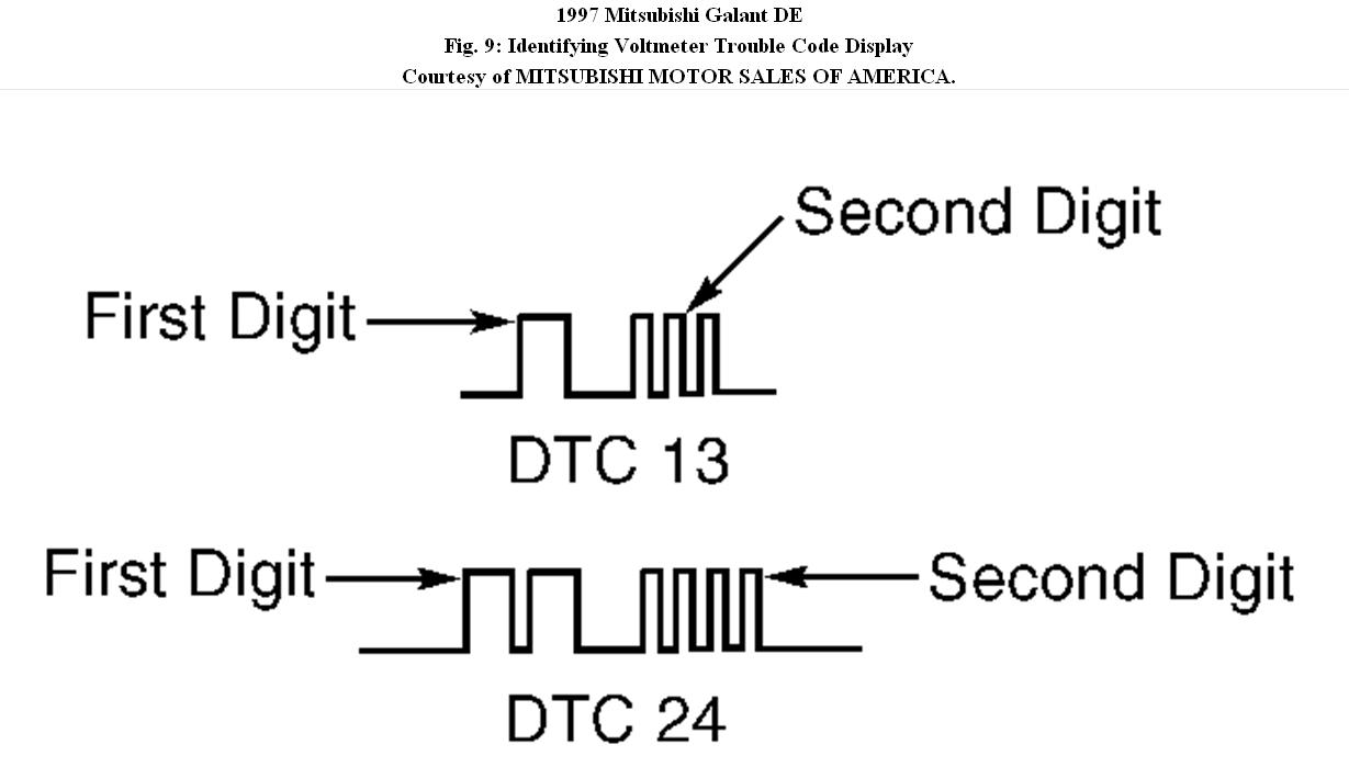 2. Turn ignition on. Note fluctuations of voltmeter needle ( oor LED blinks)to indicate DTC. The first fluctuation indicates first digit of DTC. Following fluctuations indicate the second digit of DTC. See Fig. 9. Record DTC in order displayed.