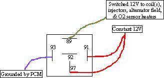 With the ASD relay, it only gets turned on for one second when the ignition switch is turned on. Obviously that's not enough time to do any troubleshooting. It turns on again during engine rotation, (cranking or running), so that isn't practical either. To allow you to power up the circuit to diagnose it, it's easiest to bypass the relay. You don't even need the ignition switch on. Jump terminals 30 and 87 together. The things on that circuit are the ignition coil pack, injectors, alternator field, oxygen sensor heaters, and fuel pump or pump relay. The feed wire to all of them is a dark green / orange wire.