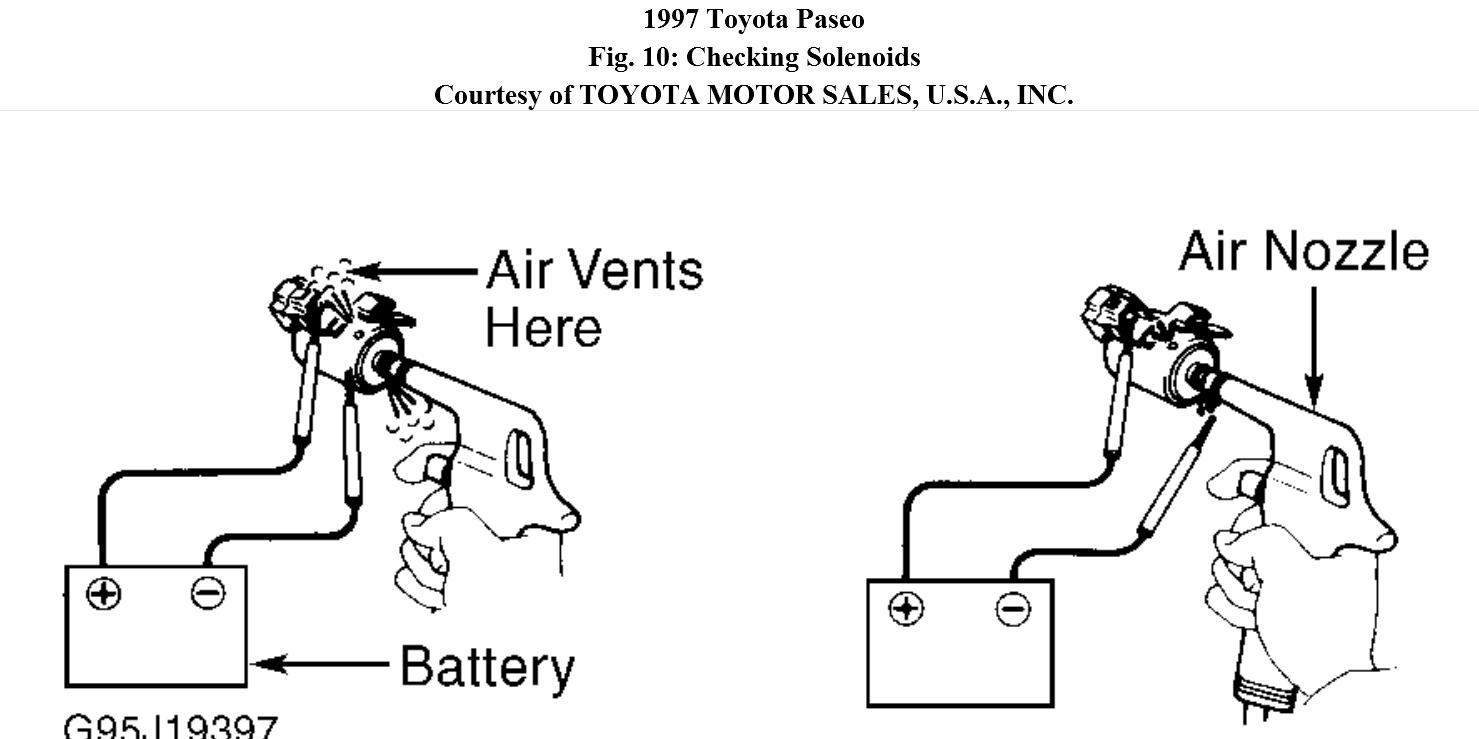 4. With battery voltage applied, air should pass through No. 1 and 2 solenoids. Disconnect voltage to solenoid. Ensure air does not pass through solenoid. Replace solenoid if defective.