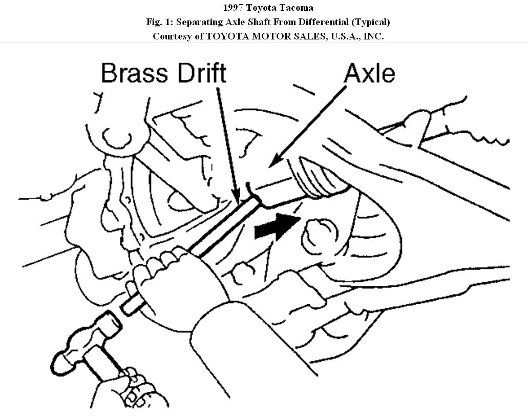 4. Using a brass drift and hammer, tap on inner joint to separate from differential. See Fig. 1 . Slide axle shaft toward steering knuckle until free of differential assembly. Use care not to damage oil seal, axle shaft boots or Anti-Lock Brake System (ABS) speed sensor rotor (if equipped). Remove axle shaft.
