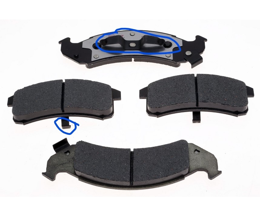 If you bought Raybestos pads the rattle clips should already be riveted to the pads like the circled areas. If they are not then you likely have the wrong parts. The only other item are the guide pin bushings and those generally are not included unless you buy specific brands. Those are available as GM-19261286, AC Delco-18K279X, or Raybestos-H5609A