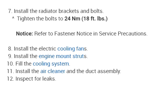 7.Install the radiator brackets and bolts.