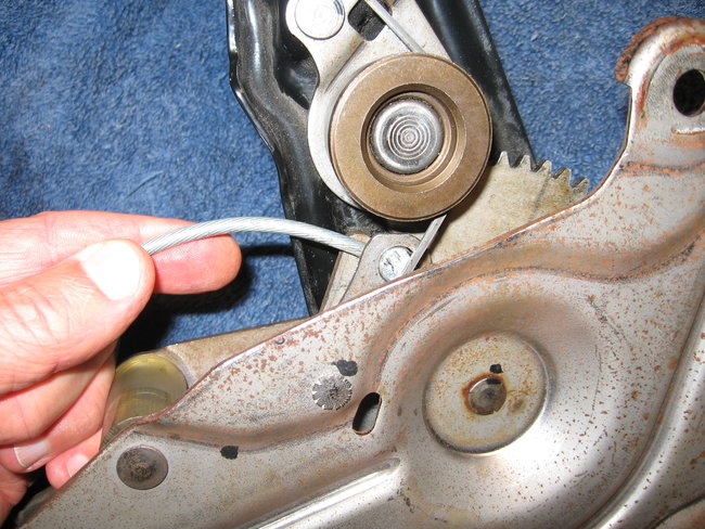 4. Remove the front parking brake cable and conduit from the bracket by compressing the retainer from the front parking brake cable and conduit from the bracket. See Fig. 16. Remove the front parking brake cable and conduit from the bracket. Remove the parking brake release mounting bolts. See Fig. 17.
