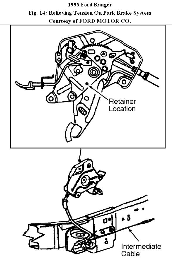 1. Relieve the tension on the parking brake system by pulling down on the parking brake intermediate cable and inserting a 5/32" (4 mm) drill bit or equivalent retainer in the parking brake control. See Fig. 14.