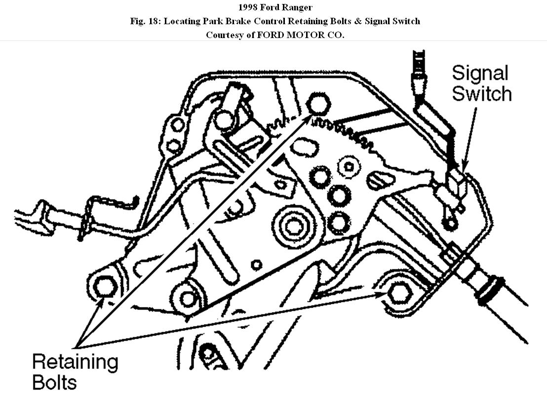 5. Remove the parking brake control and front parking brake cable and conduit by disconnecting the parking brake signal switch electrical connector and removing the three parking brake control bolts. See Fig. 18. To install, reverse removal procedure. Tighten bolts and nuts to specification.