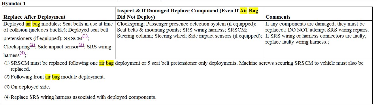 Please note that the Air Bag/SRS system is a complicated circuit that is all intertwined into one circuti that works to gether in the event of a collision.