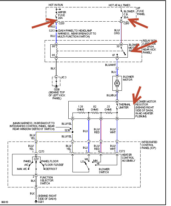 Where is the blower motor found on my 1998 mercury tracer. I was driving and my a/c just quit working. Now none of my heating functions are working. If its not my blower motor what else could it be? Also how can I see if its just clogged.