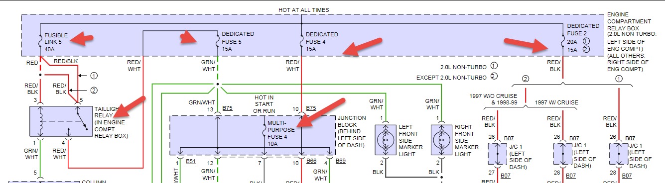 I assume you have checked the bulbs. check everything pointed out in pic with a test light then if you have alike relay replace with another or go to our site here and look under repair electrical how to test relay. then check ground which is in center of lift gate. Finally if still not working test the green wire to see if it has power. if your sidelights work with headlights on the taillights should as well. it may be a socket problem if green wire has power.