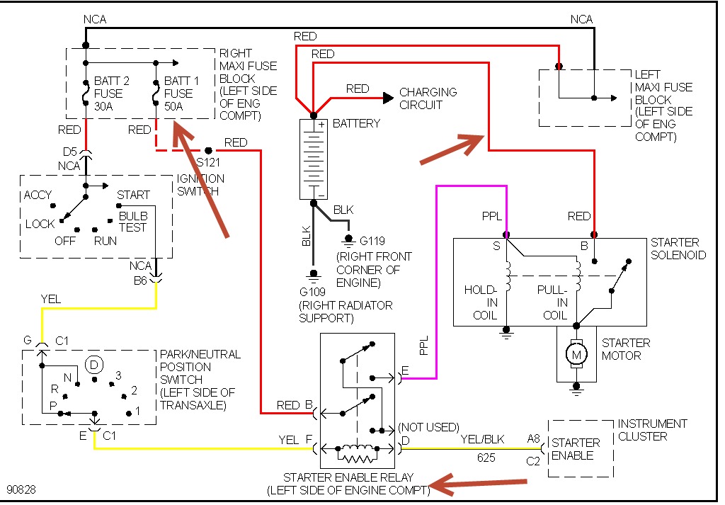The fuse I'm talking about is under the hood on the right hand side on the fuse box, and it's the 3rd fuse from the bottom. It powers the red wire that connect to the starter from the battery. Before I replaced the starter there would be smoke coming from this starter under the manifold when I put that fuse in the battery slot. It's the 3rd fuse from the bottom (50watts) on the right hand side of the fuse box