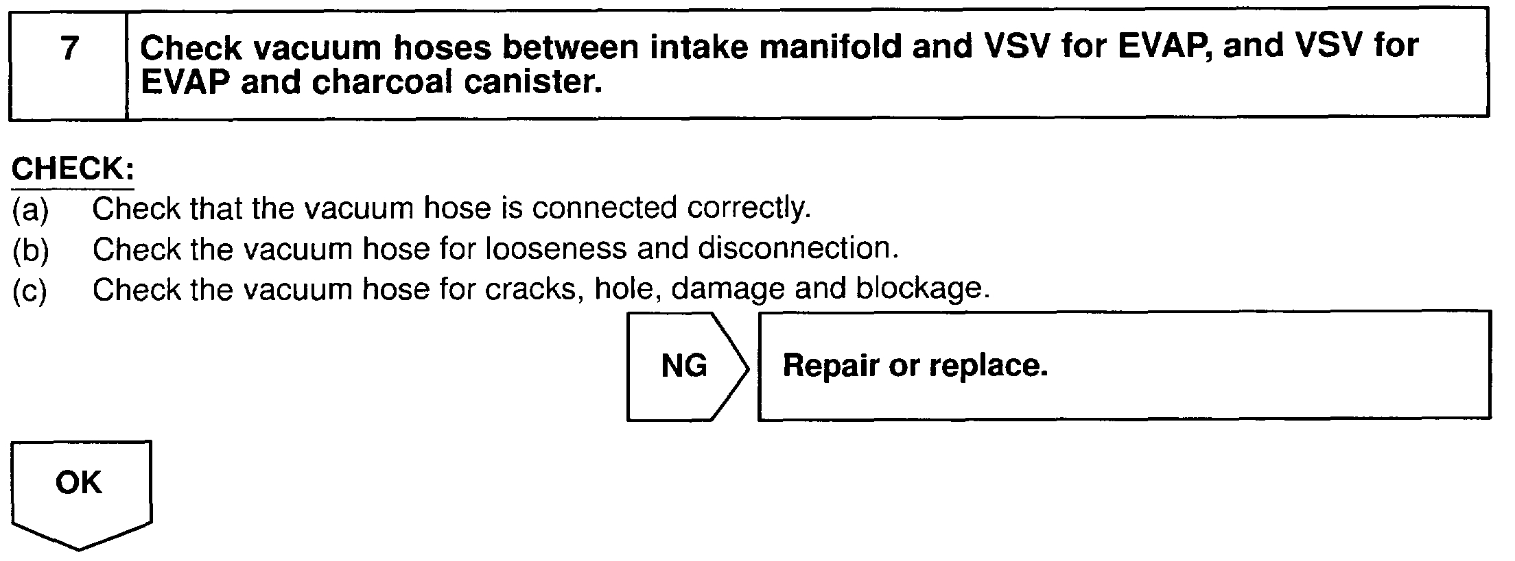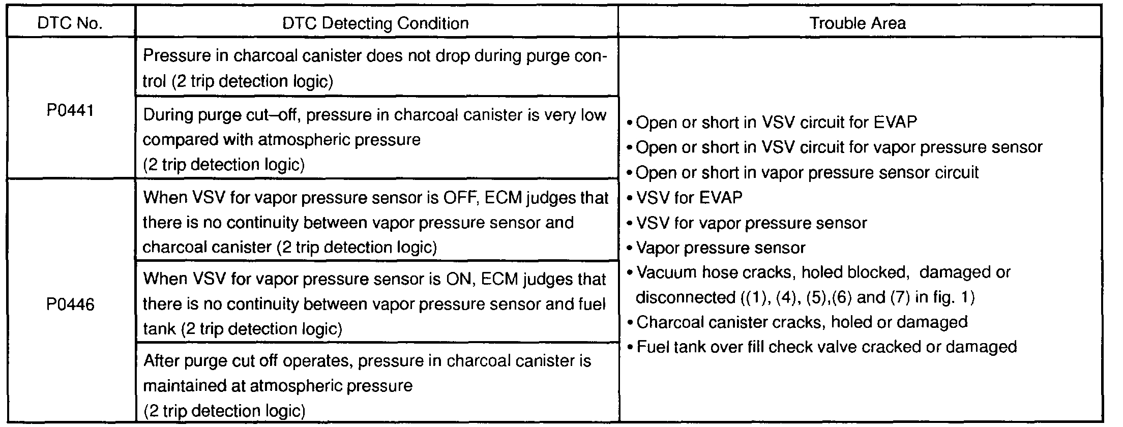 DTCs P0441 and P0446 are recorded by the ECM when evaporative emissions leak from the components within the dotted line in fig, or when there is a malfunction in either the VSV for EVAP, the VSV for vapor pressure sensor, or in the vapor pressure sensor itself.