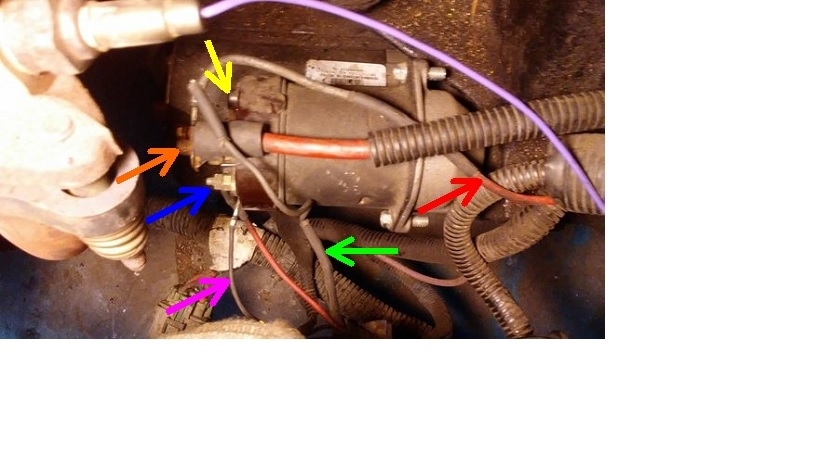 The purple wire, (purple arrow), goes to the smaller "S" terminal on the solenoid, (blue arrow). That is always the only wire that goes there. That is the one that activates the solenoid when it gets 12 volts from the starter relay, or in some cases, directly from the ignition switch.