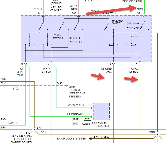 it may be the multi function switch on column check to see if brake switch sends power then goes out of it. see pic for what wires to check