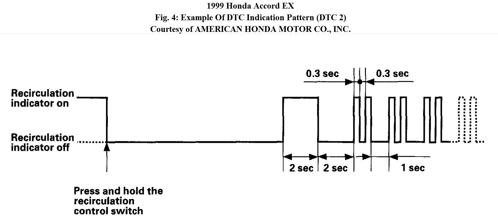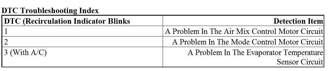 3. Press and hold the recirculation control switch to Fresh (recirculation indicator goes off). Continue to hold the switch until the recirculation indicator comes on for 2 seconds, then it will blink the Diagnostic Trouble Code (DTC) to indicate a