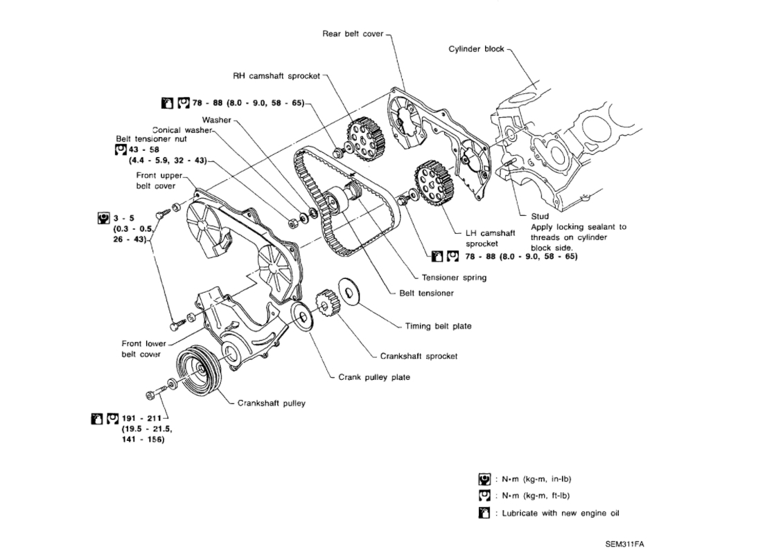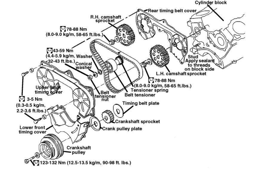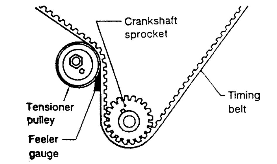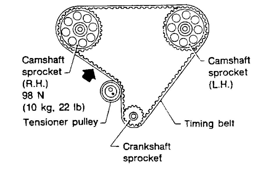 8. Push middle of timing belt between R.H. camshaft sprocket and tensioner pulley with force of 98 N (10 kg, 22 lbs.).