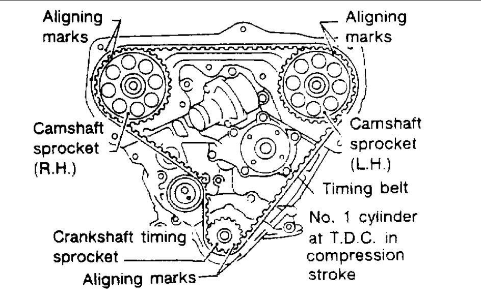 (1)Align white lines on timing belt with punchmarks on camshaft sprockets and crankshaft sprocket.