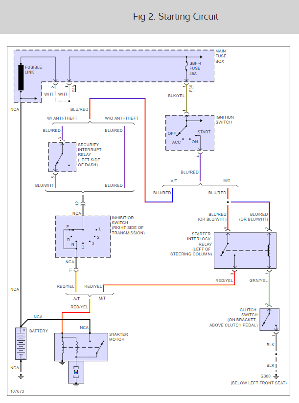 Yours has a security interrupt relay instead. It has to be that or the neutral switch on the transmission. https://www.2carpros.com/images/external/Starterwiring98Outback.jpg
