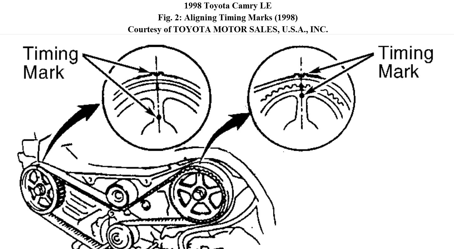 My car has the 2.2 liter 5 SFE engine. I am re-assembling the head after replacing the head gasket and I am having trouble with setting up the cams. I can set up the inlet cam timing with top dead center, but when I look to the marks on the rear of the cam sprockets, I have one mark on the inlet cam (no problem there), but have three marks on the rear of the exhaust cam sprocket. Which one of the three do I align with the inlet cam mark?