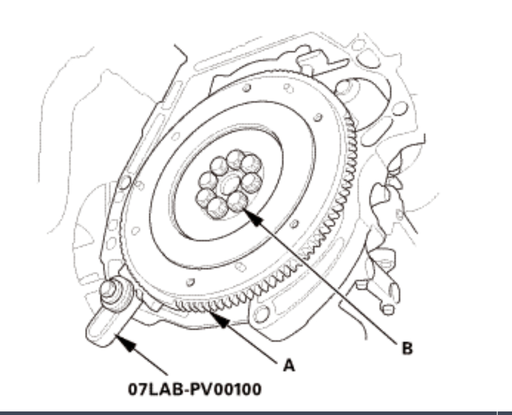NOTE: Loosen the flywheel mounting bolts (B) in a crisscross pattern in several steps.