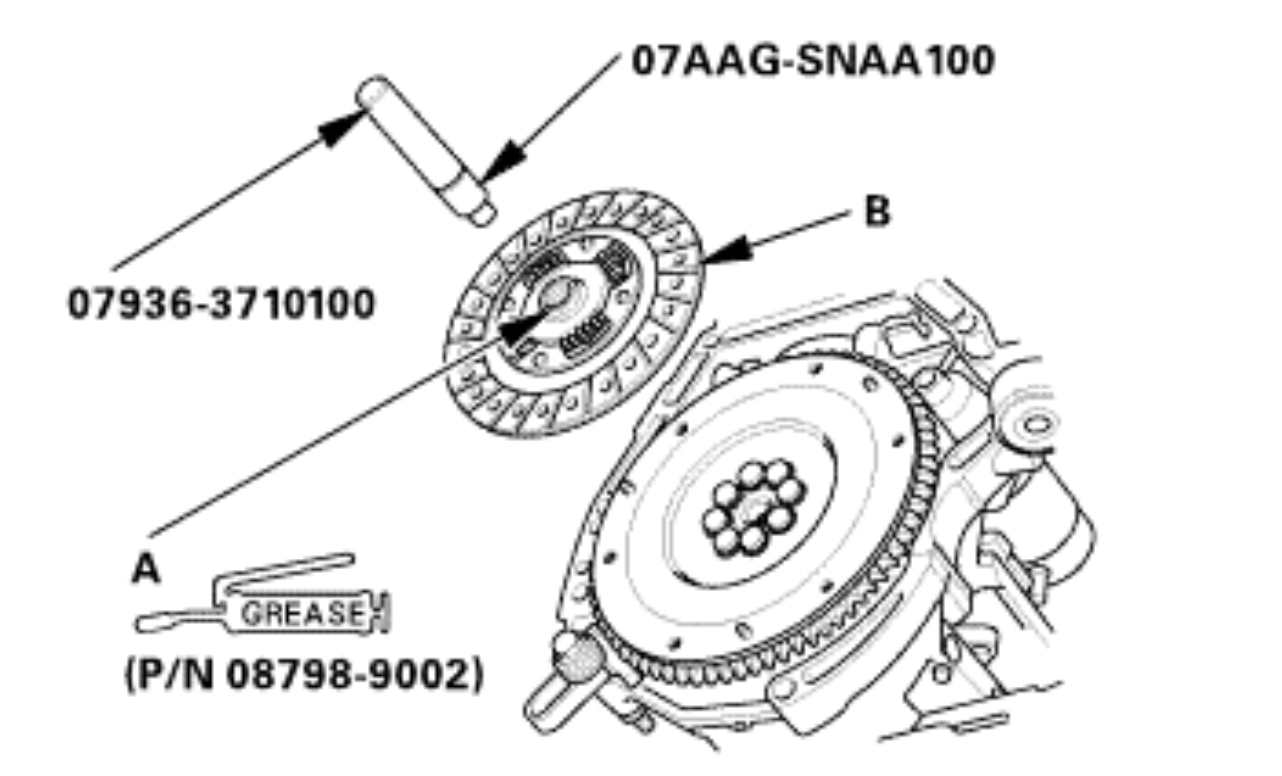 Apply super high temp urea grease (P/N 08798-9002) to the splines (A) of the clutch disc (B).