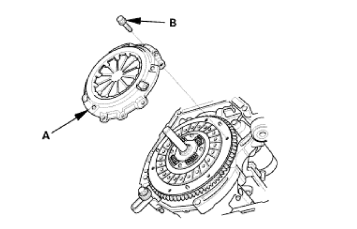To prevent warping, loosen the pressure plate mounting bolts (A) in a crisscross pattern in several steps.