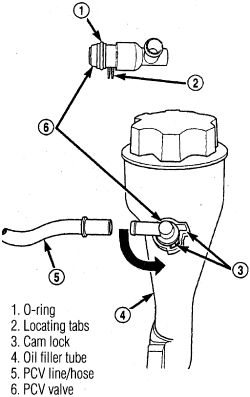 To remove oil filler PCV valve, first disconnect the hose. Rotate the valve CCW until the locating tabs have been freed at cam lock, and then, pull the valve straight out (AZ).