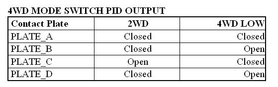 Turn ignition on, engine off. Monitor GEM PIDs PLATE_A, PLATE_B, PLATE_C and PLATE_D. Place 4WD mode switch in 2WD position and record PID values. Depress brake pedal. Place transmission in Neutral. Move 4WD mode switch to 4X4 LOW position and record PID values. Compare PIDs recorded with the following table. See 4WD MODE SWITCH PID OUTPUT table. If PIDs match with table, inspect and repair transfer case for possible internal malfunction. Clear DTCs and retest system. If PIDs do not match table, go to next step.