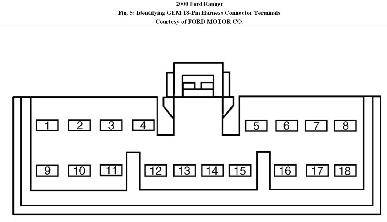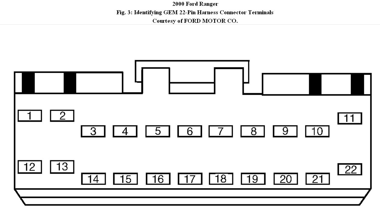 Using DVOM, check for voltage on Gray wire between ground and terminal No. 14 on GEM 22-pin harness connector. See Fig. 3. If voltage is present, repair short to voltage in Gray wire. Clear DTCs and retest system. If voltage is not present, go to next step.