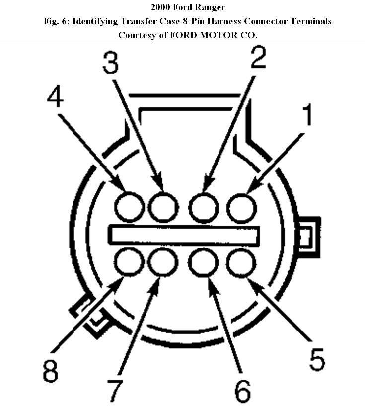 Trigger GEM active command CW/CCW to OFF. Using ohmmeter, measure resistance between ground and terminals No. 4 (Yellow wire) and 7 (Orange wire) on transfer case 8-pin harness connector. See Fig. 6. If resistances are less than 5 ohms, reconnect transfer case 8-pin connector and go to step 58. If resistances are not less than 5 ohms, go to step 57.