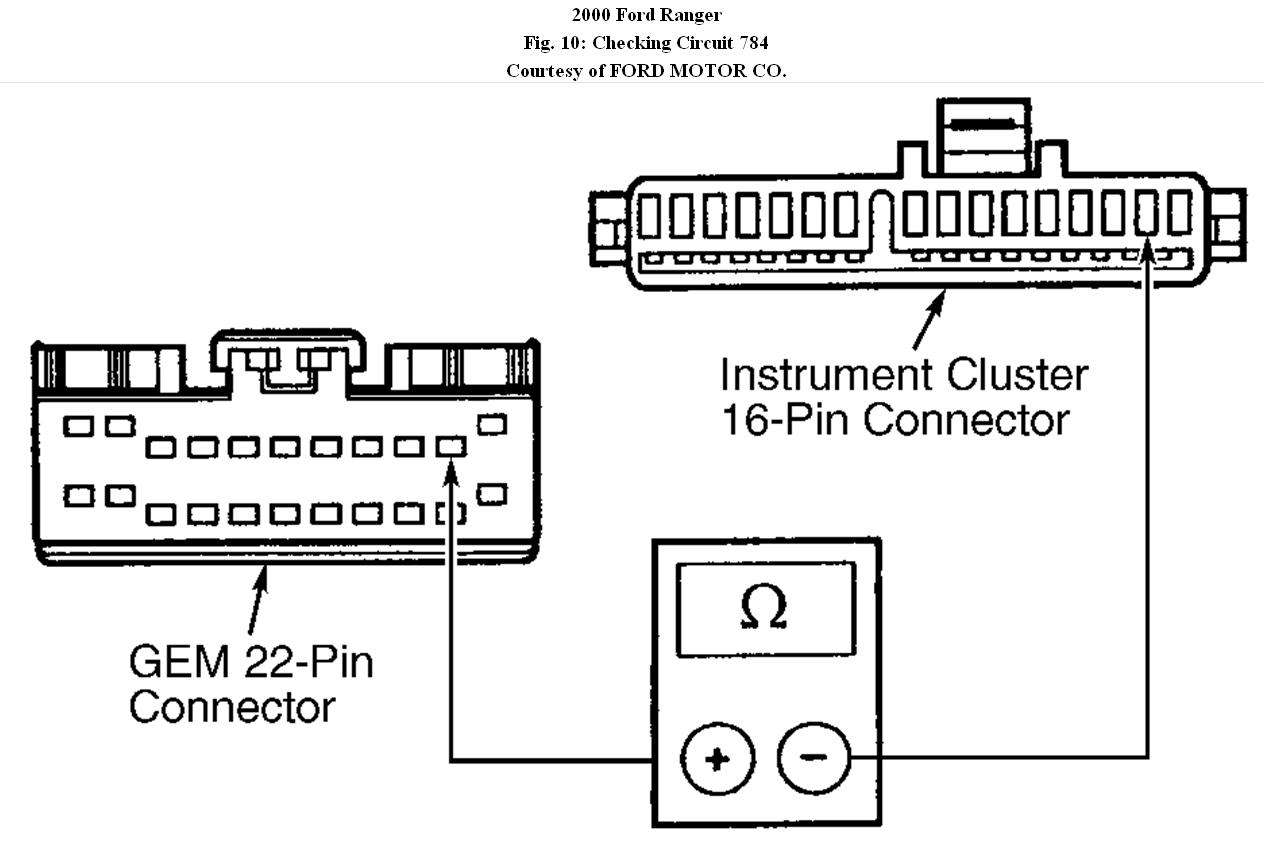 Turn ignition off. Disconnect GEM 22-pin connector and instrument cluster. See Fig. 2. Using ohmmeter, measure resistance of Light Blue/Black wire between terminal No. 2 at instrument cluster harness connector and terminal No. 10 at GEM harness connector. See Fig. 10. If resistance is less than 5 ohms, go to next step. If resistance is not less than 5 ohms, repair open in Light Blue/Black wire. Clear DTCs and retest system.