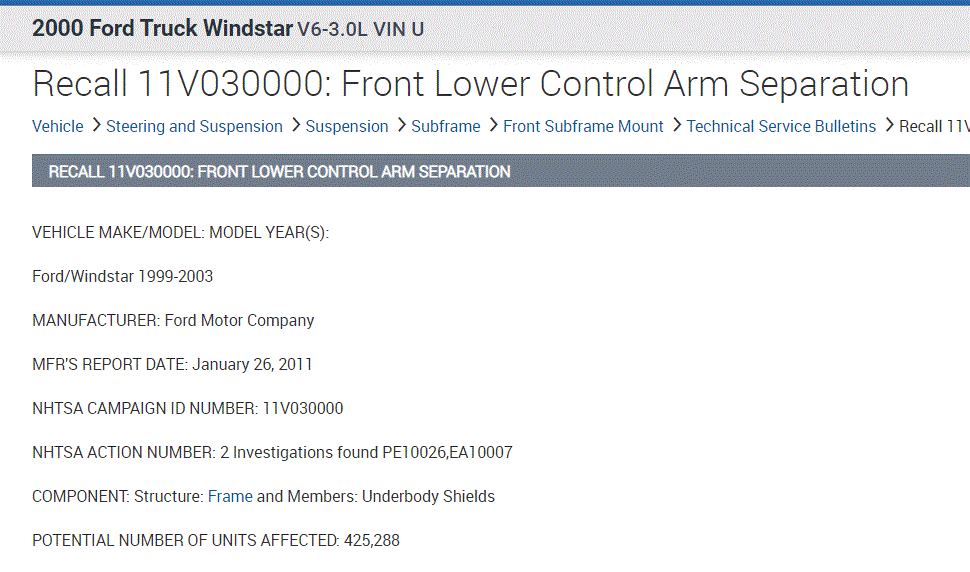 There was a recall on the vehicle's lower control arms (separating at rear mount), the subframe mounts, and the body mounts. This was causing issues with the intermediate shaft and in some cases, the intermediate shaft was coming disconnected.