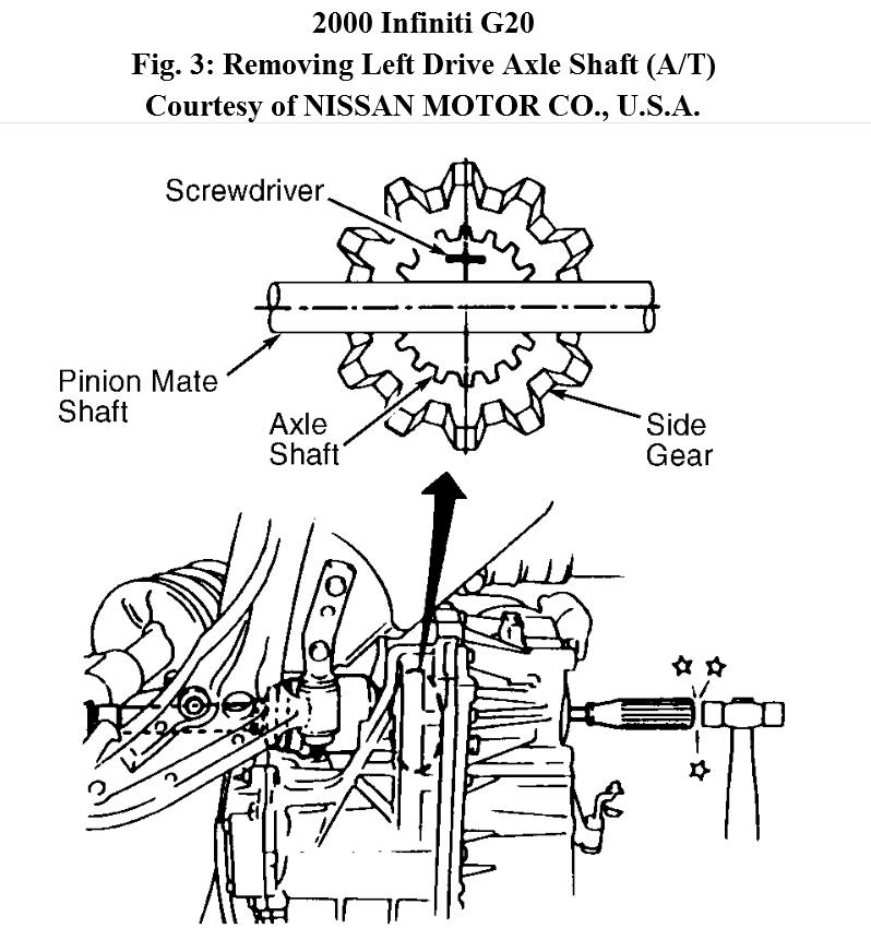 4. On M/T vehicles, remove left axle in same manner as in step 3) . On A/T vehicles, insert long drift through differential, and drive axle shaft out of transaxle case. See Fig. 3 .