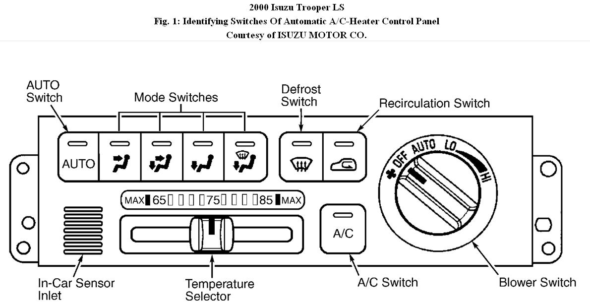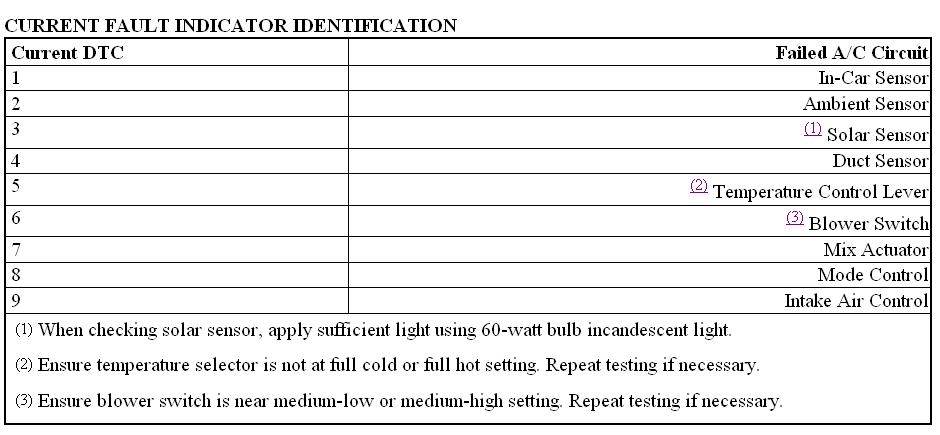 1. Turn ignition switch to OFF position. Place A/C-heater control panel blower switch and temperature selector at mid-range settings. While holding down both the AUTO switch and defrost switch at control panel, start engine. See Fig. 1 . Continue to hold switches down until A/C switch LED indicator begins to flash (within 10 seconds), then release switches. Monitor and identify A/C switch LED flashing sequence through a series of indicator flashes (1-9), followed by a 3 second pause, then sequence will repeat.