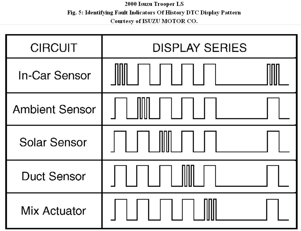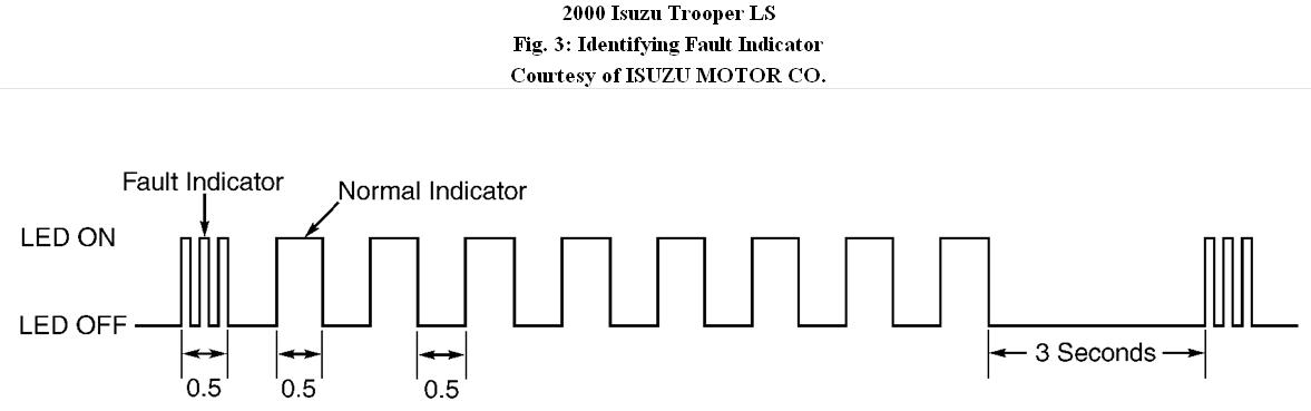 2. A normal indicator flash consists of a .5 second on, .5 second off pulse. Each indicator flash represents a circuit monitored by automatic A/C control unit. A normal pattern (with no current DTCs present) consists of 9 indicator flashes, then pause for 3 seconds before repeating. A fault indicator is identified by 3 rapid flashes in the place of a normal indicator flash. See Fig. 3 .