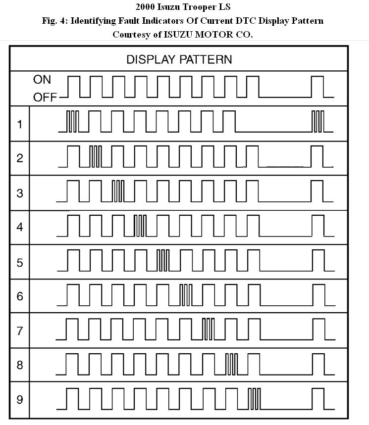 3. Monitor current DTC display patterns of 9 indicator flashes. Check if any fault indicators are present during display pattern. If any fault indicator(s) are displayed, verify which indicator (1-9) is displaying a current DTC. See Fig. 4 .