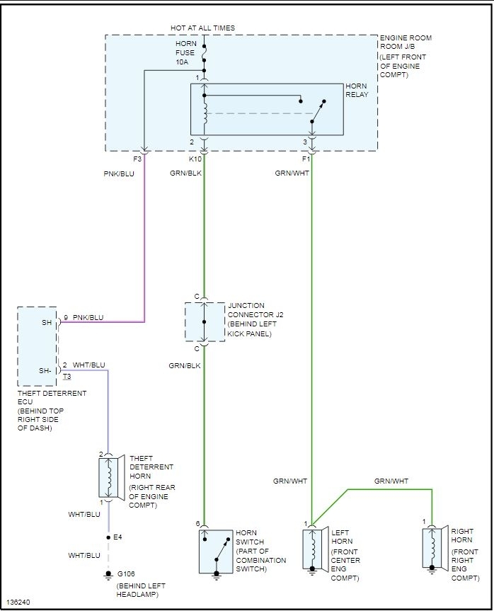You said the horn 10 Amp fuse is okay and the horn is okay. Try checking the Horn Relay. On the fuse/relay box beside the left fender, The horn relay is the black rectangle relay (beside the green square relay). It should show "HORN" at the back of the fuse/relay cover.