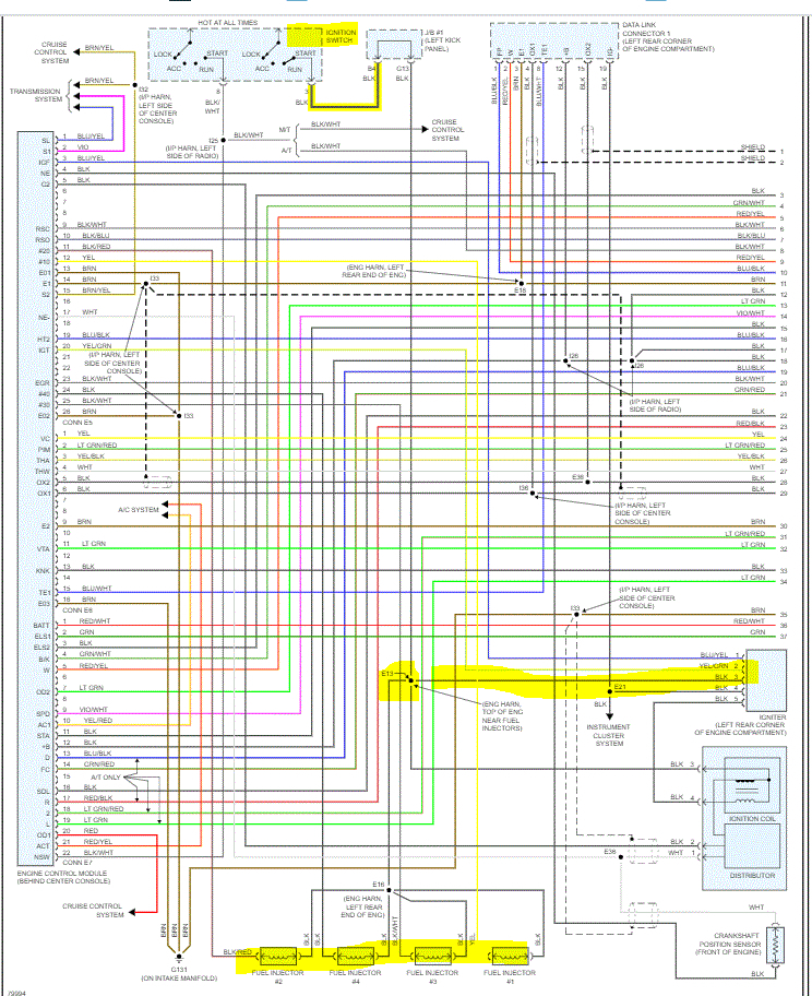 That is a great question. I looked through the schematic and found the power from the ignition switch powers all the igniter and fuel injection See pic 2. It appears the ECM provides a ground path for injection to occur. I did notice there is a splice in the wire between the ignition and injectors. Take a look at the attached pic. You may want to check that splice.