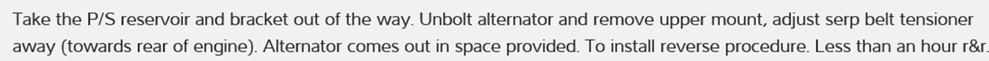 get radio anti theft code first then disconnect battery negative cable. disconnect cables form alternator then follow instructions in pic.