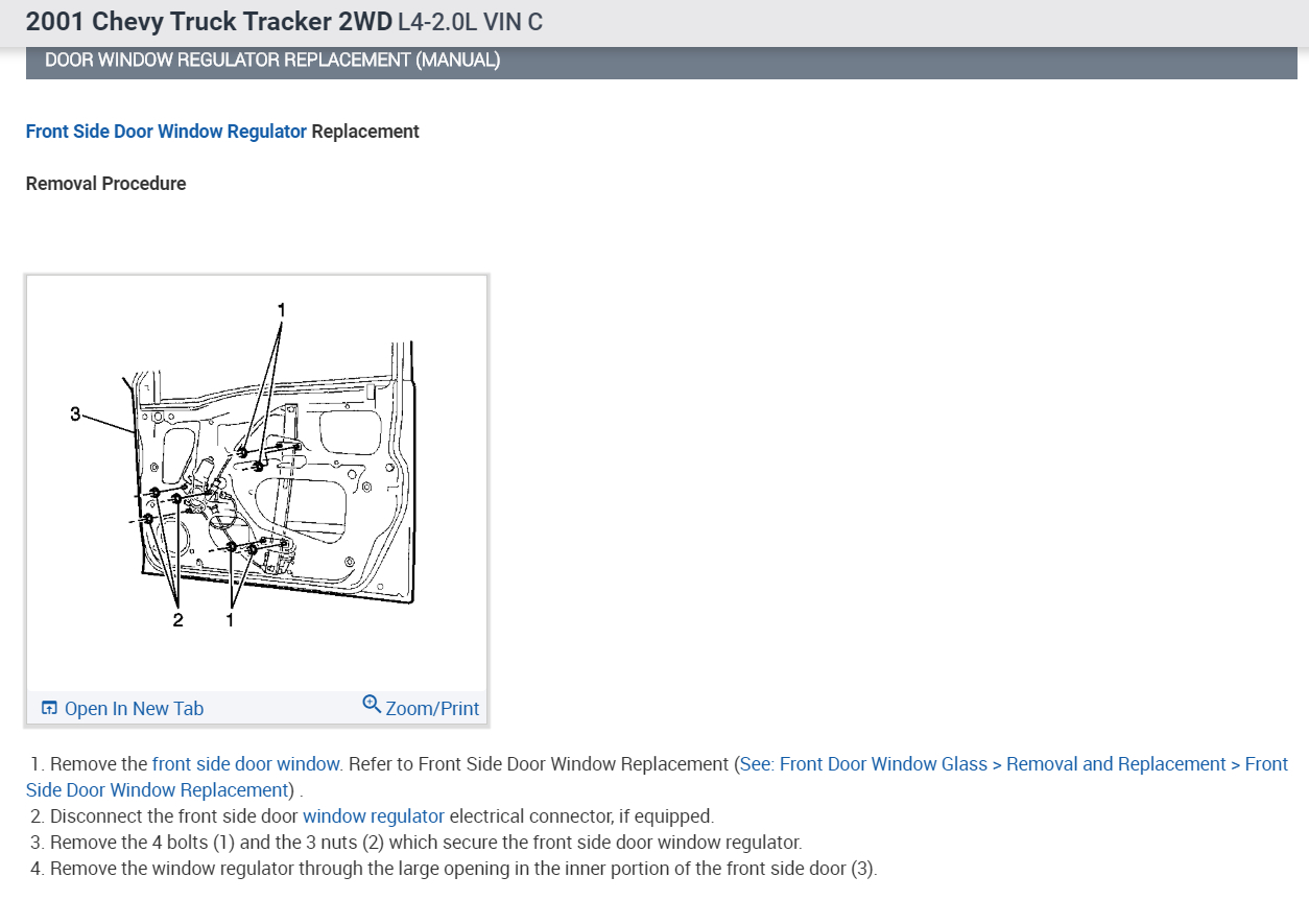 Power windows going up crooked is probably not caused by a bad regulator. The problem is a split rubber window track in the front of the window. I had the same issue on my 2002 Tracker 4 door drivers side window and fixed it by ordering and replacing the rubber window track. The replacement (universal) track is thinner, but works fine. I removed the door panel, and window, then cut out the damaged section of track at the seam near the place where the window angles, then butted the new section of track with the existing track, and pushed it in starting at the top. The whole job takes less than an hour.
